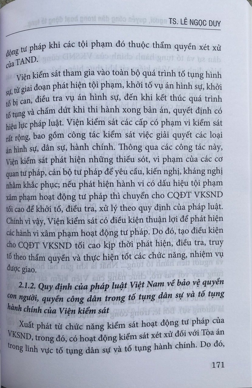 Nhằm đáp ứng nhu cầu tìm hiểu và nghiên cứu của bạn đọc, Nhà xuất bản Tư pháp xuất bản cuốn "Bảo vệ quyền con người, quyền công dân trong hoạt động tố tụng của Viện kiểm sát nhân dân ở Việt Nam hiện nay" của TS. Lê Ngọc Duy. Thông qua việc phân tích, luận giải về mặt lý luận và đánh giá, khảo cứu về mặt thực tiễn bảo vệ quyền con người, quyền công dân trong hoạt động tố tụng của Viện kiểm sát nhân dân, tác giả đề xuất một số giải pháp mang tính gợi mở cần được tiếp tục nghiên cứu nhằm hoàn thiện pháp luật và nâng cao hiệu quả bảo vệ quyền con người, quyền công dân trong hoạt động tố tụng của Viện kiểm sát nhân dân ở Việt Nam hiện nay. Nhà xuất bản giữ nguyên một số ý kiến của tác giả trong cuốn sách có thể còn có quan điểm khác nhau để bạn đọc tham khảo.