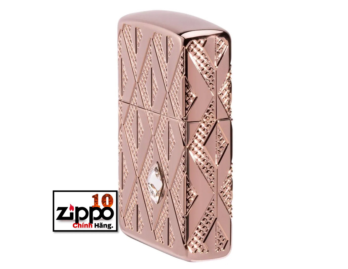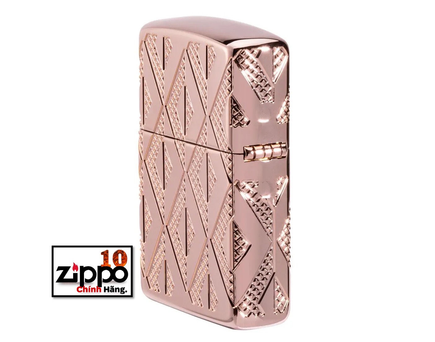 Zippo giới thiệu một lựa chọn mới cho dòng vỏ dày Armor màu vàng hồng, Armor Rose Gold. Trong thiết kế trang sức, vàng hồng tiếp tục là xu hướng và được khách hàng yêu thích. Giờ đây, Zippo cung cấp màu kim loại phổ biến này trong dòng vỏ Armor phổ biến, cho phép Khắc sâu, MultiCut và các quy trình sang trọng khác phù hợp nhất với các thành vỏ dày hơn, như được thấy trong thiết kế này. Thiết kế này có các họa tiết kim cương MultiCut được bao bọc xung quanh vỏ Armor Rose Gold với một viên pha lê hình kim cương được đính ở mặt trước. Được đóng gói trong một hộp đựng dạng quà tặng. Để tối ưu hiệu suất, hãy dùng nhiên liệu bật lửa của Zippo.