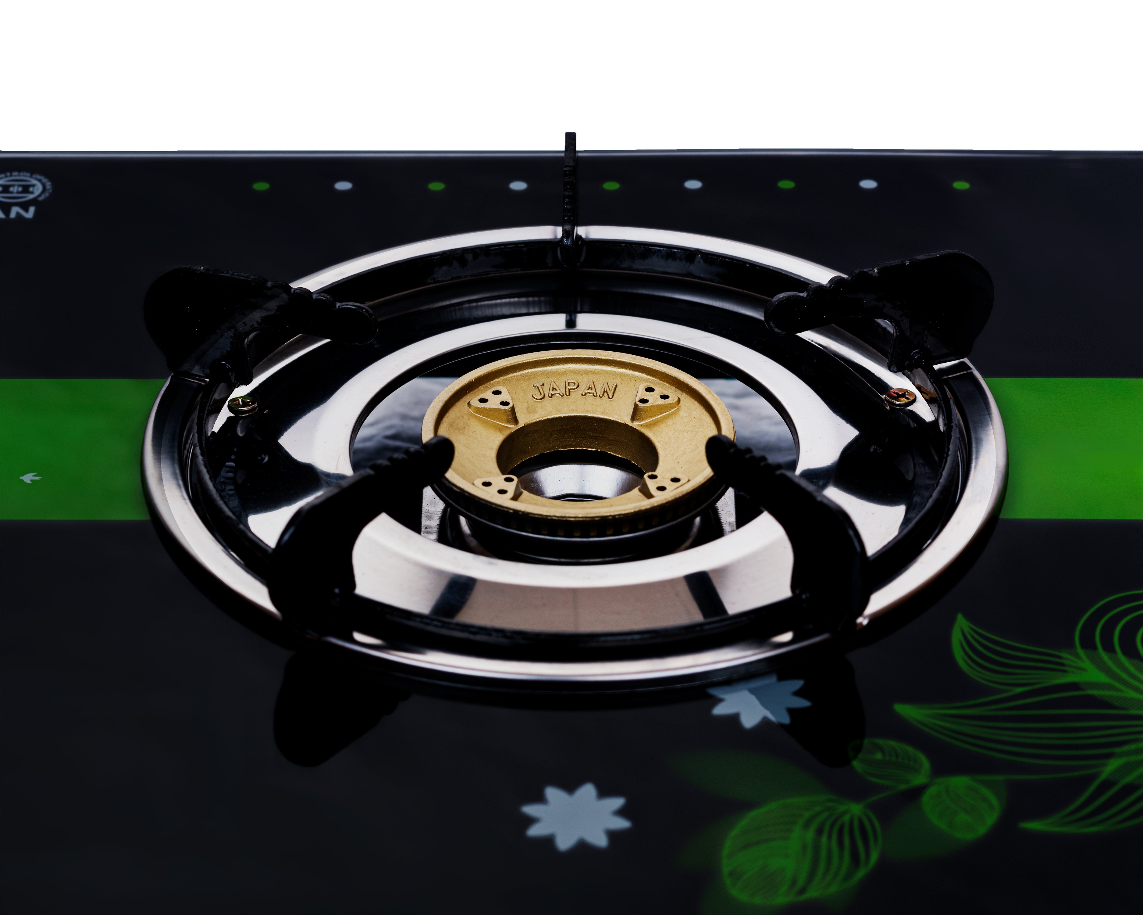 * Mặt kiếng cao cấp chịu lực, chịu nhiệt, thiết kế hoa văn sang trọng; - Thân bếp làm bằng inox chống rỉ sét, cao 60mm; - Núm vặn kiểu Rinnai; - Kiềng thép sơn