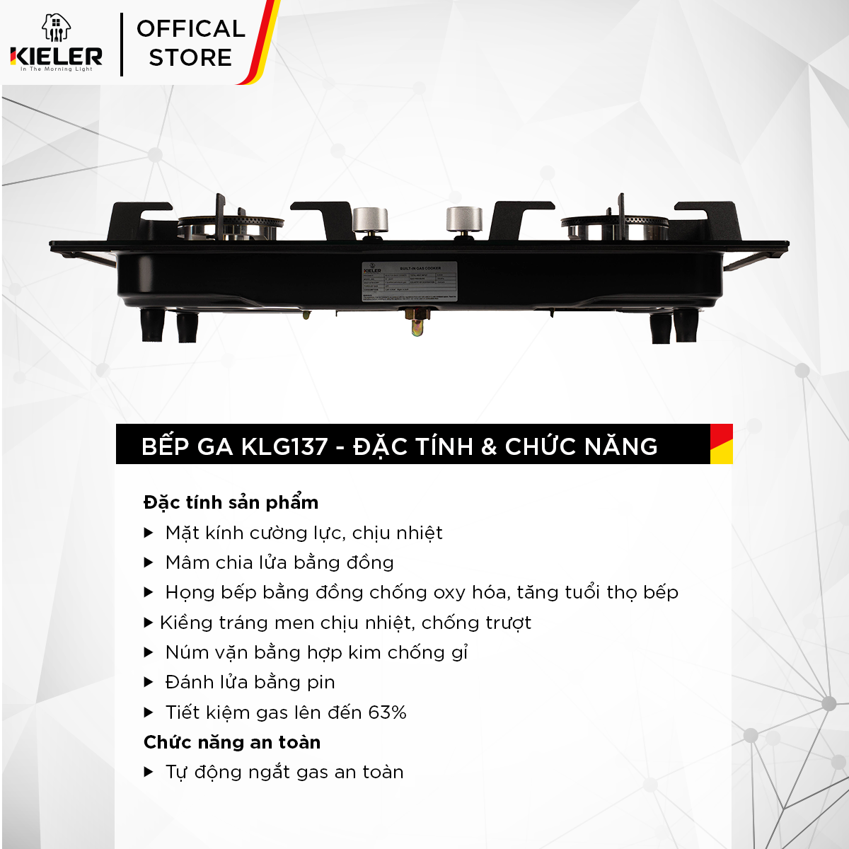 • Tên sản phẩm: Bếp gas mặt kính cường lực KIELER KL-G137 tiết kiệm gas, công suất mạnh 5000W, mặt bếp chịu nhiệt tốt - Miễn phí lắp đặt