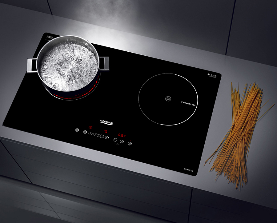 - Bếp Hỗn Hợp 02 Vùng Nấu Chef's EH-MIX330 sử dụng đa năng với bếp hỗn hợp EH-MIX330 - Mặt kính ceramic chịu nhiệt Schott Ceran vát cạnh – Germany - Mâm nhiệt EGO Hi-light,