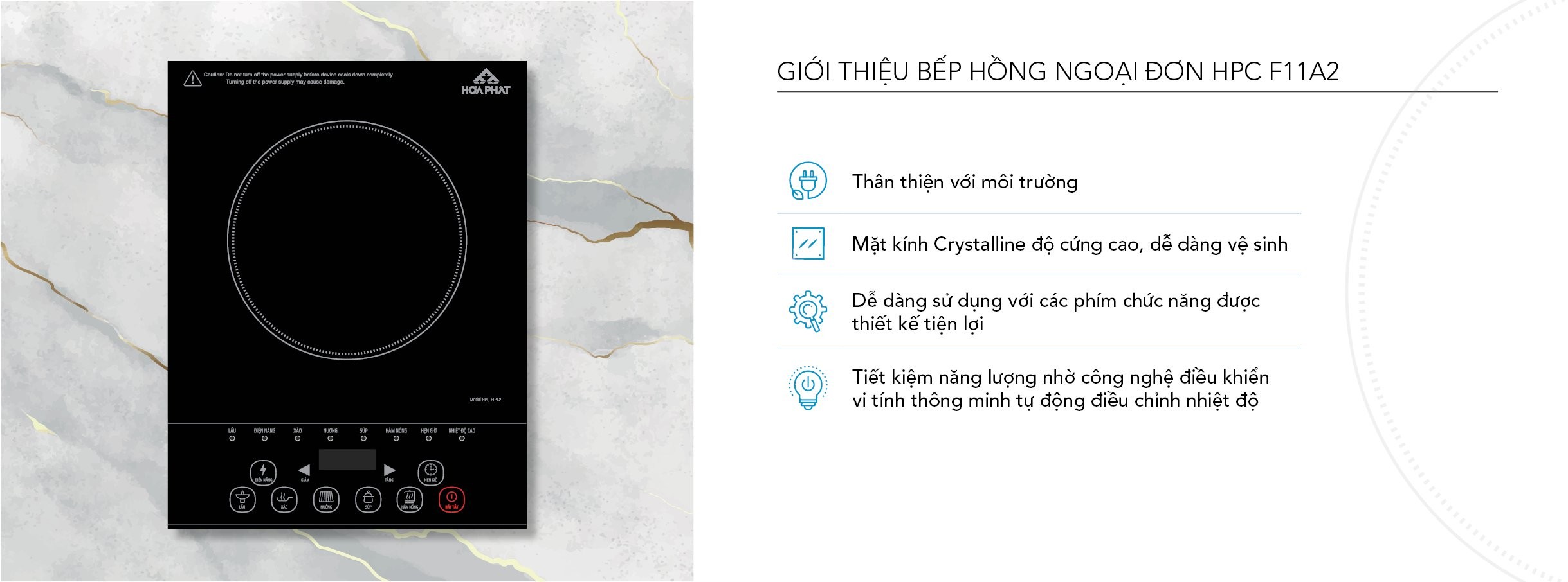 Bếp hồng ngoại đơn HPC F11A2 mang đến giải pháp đun nấu an toàn, hiện đại và thân thiện, không tạo lửa, không tạo các-bon monoxit gây hại cho sức khỏe.