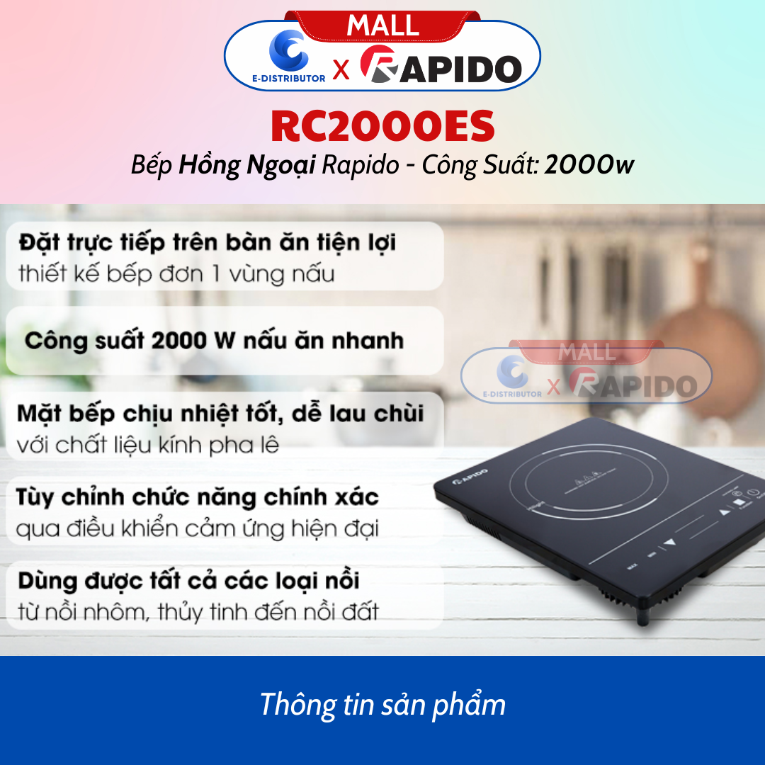 THÔNG TIN SẢN PHẨM 1*Thông số kĩ thuật bếp hồng ngoại đơn Rapido RC2000ES - Công suất 2000w - Loại bếp: Bếp hồng ngoại đơn - Công suất vùng nấu: 2000 W - Chất liệu mặt bếp: Pha lê - Bảng điều khiển: Cảm ứng - Loại nồi nấu: Tất cả loại nồi - Tính năng an toàn: Cảnh báo mặt bếp nóng - Thương hiệu của: Đức - Hãng Rapido. *MÔ TẢ SẢN PHẨM  - Điều khiển cảm ứng - Công suất 2000W - Màn hình hiển thị 4 số, hẹn giờ - Tự động bảo vệ khi điện áp quá cao/quá thấp - Điều khiển đơn giản dễ sử dụng. - Bộ phận gia nhiệt cấu tạo từ hợp kim quý như Ni, Cr hiệu suất cao. - Màn hình hiển thị 4 số, hẹn giờ - Tự động bảo vệ khi điện áp quá cao/quá thấp