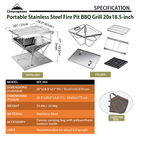 MÔ TẢ SẢN PHẨM BẾP NƯỚNG THAN HOA GẤP GỌN 8-10 NGƯỜI CAMPINGMOON MT-055 * THÔNG TIN SẢN PHẦM: - Thương hiệu: Campingmoon - Mã sản phẩm: MT-055 - Chất liệu: Thép không gỉ, Gang,