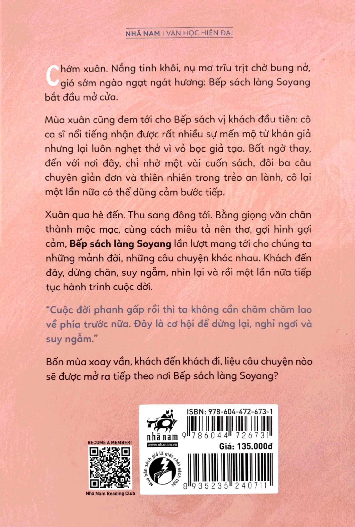 Xuân qua hè đến. Thu sang đông tới. Bằng giọng văn chân thành mộc mạc, cùng cách miêu tả nên thơ, gợi hình gợi cảm, Bếp sách làng Soyang lần lượt mang tới cho chúng ta những mảnh đời, những câu chuyện khác nhau. Khách đến đây, dừng chân, suy ngẫm, nhìn lại và rồi một lần nữa tiếp tục hành trình cuộc đời.