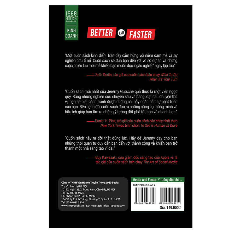 Better And Faster: Ý Tưởng Đột Phá Trong Kinh DoanhNếu mong muốn đọc một cuốn sách viết thật tỉ mỉ, kỹ lưỡng, đầy sức sống và  về các ý tưởng kinh doanh, bạn đã tìm đến đúng địa chỉ.Jeremy Gutsche l...