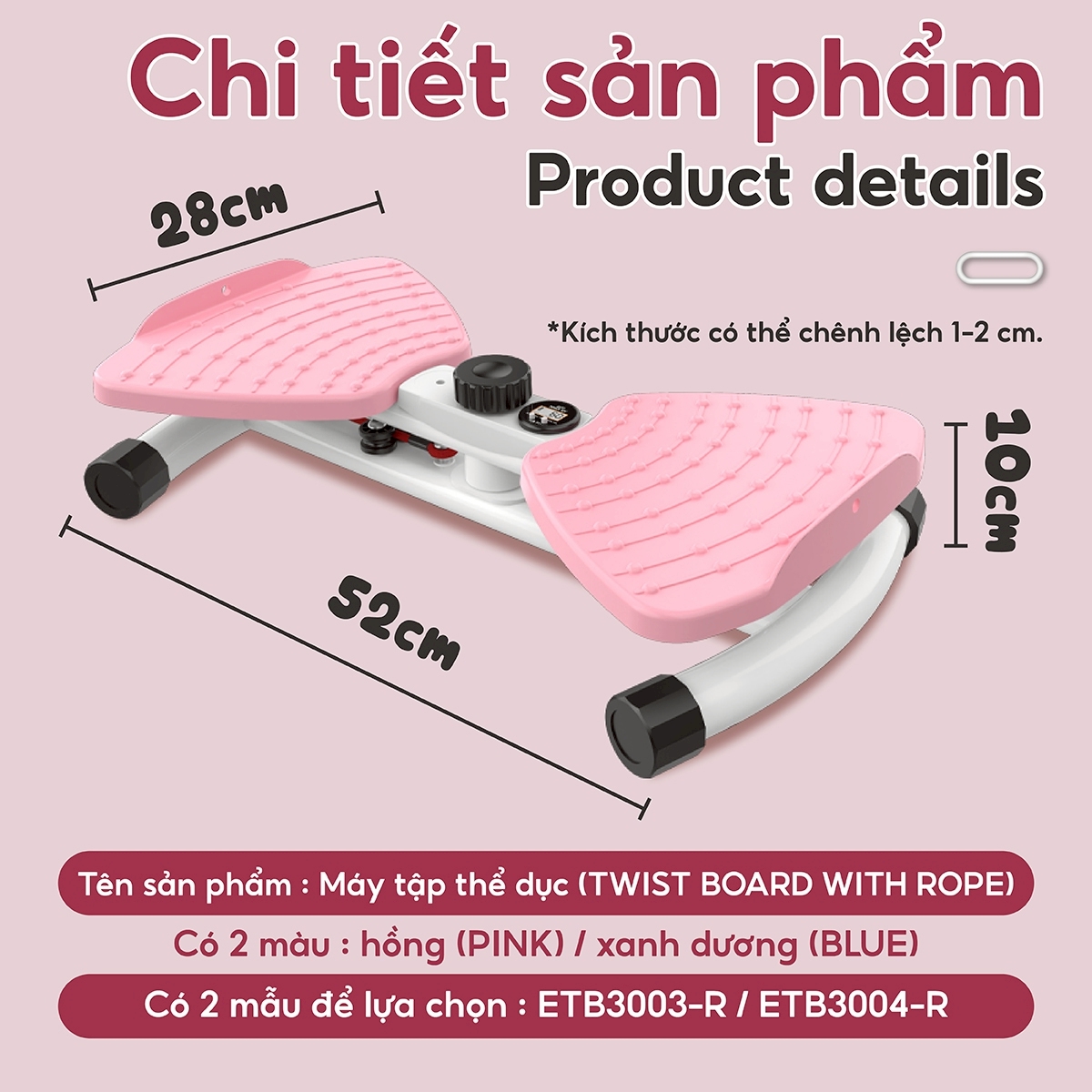 - NHỰA ABS: Dụng cụ vặn được làm bằng nhựa ABS tuyệt hảo, có khả năng chống mài mòn và va đập tốt, đồng thời có tuổi thọ cao. Dây rút đàn hồi chắc chắn, giúp tăng cường khả năng cân bằng và ổn định cơ thể khi vặn người. Chất liệu khung chịu lực bằng thép carbon chất lượng cao. Tải trọng lên đến 150kg TÊN SẢN PHẨM: Bàn xoay eo . CHẤT LIỆU: Thép ống, nhựa ABS . TẢI TRỌNG: 150kg . TRỌNG LƯỢNG: 3.5Kg Màu sắc: Xanh/Hồng