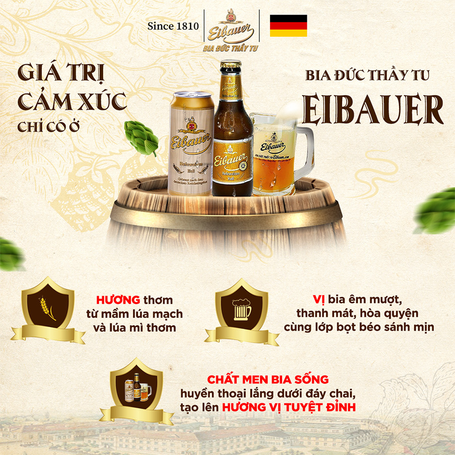NUÔI DƯỠNG ĐAM MÊ VÀ CẢM XÚC Đây chính là giá trị thực mà hơn 200 năm qua Bia Thầy tu Eibauer luôn hướng đến. Bia thầy tu vàng Eibauer có thành phần chủ yếu là mầm lúa mạch. Chỉ vài hớp cảm xúc rạo rực hơn rất nhiều. Đi làm căng thẳng mệt mỏi... chỉ với 1 lon bia, cảm giác vui vẻ hưng phấn lại dạt dào, năng lượng tích cực lại tràn trề. Thức dậy sảng khoái, đầu óc nhẹ nhàng, cơ thể mạnh mẽ - một thứ hương vị của cảm xúc đầy lịch lãm và tinh tế.