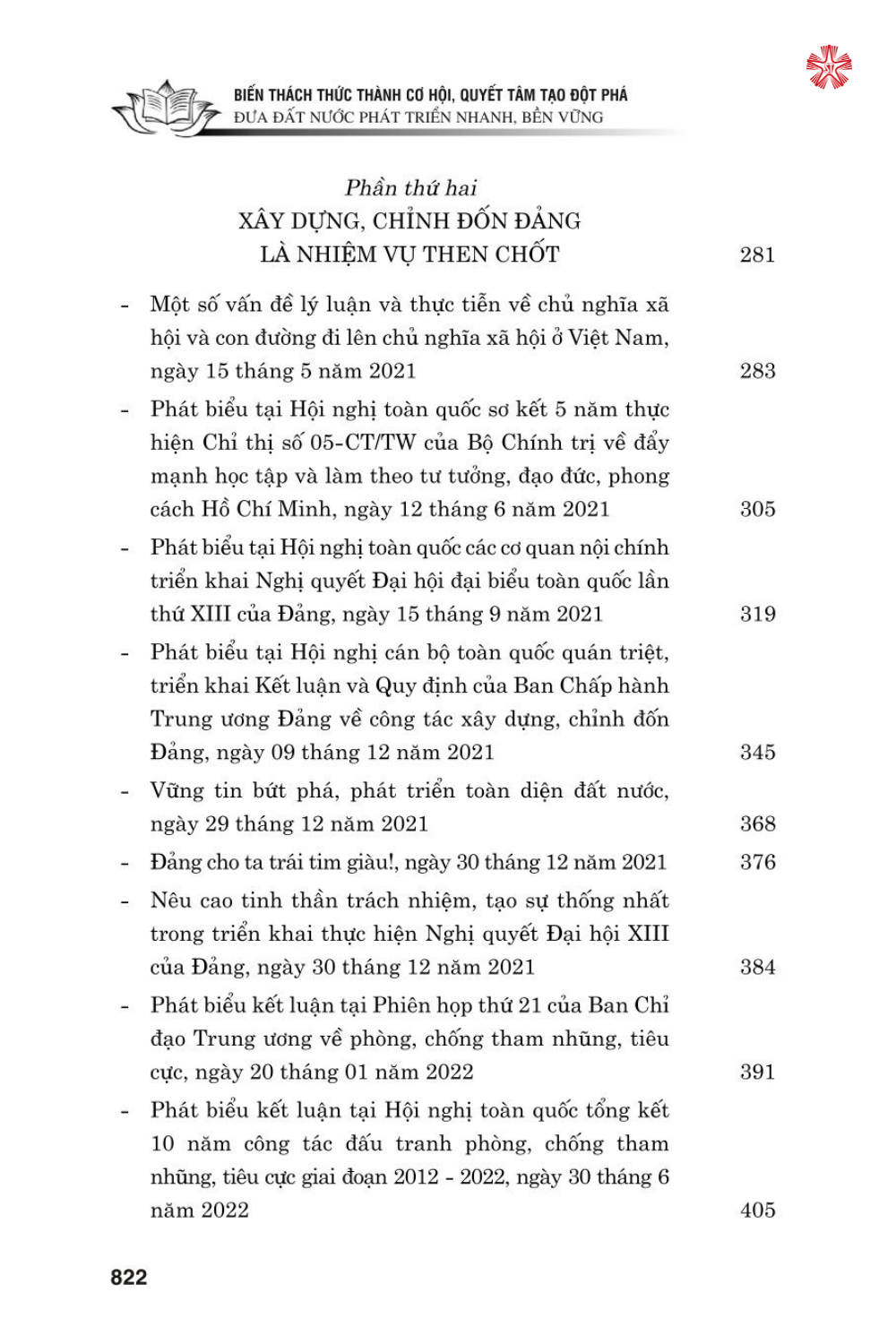 Cuốn sách “Biến thách thức thành cơ hội, quyết tâm tạo đột phá đưa đất nước phát triển nhanh, bền vững” tuyển chọn các bài phát biểu, bài viết, bài trả lời phỏng vấn, thư,