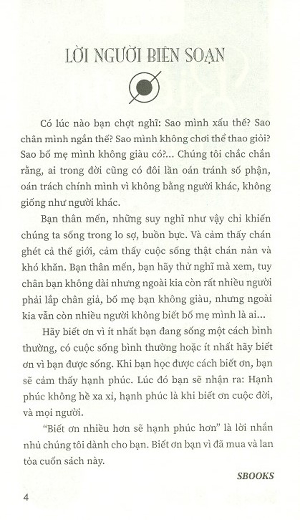 Mua tại TiktokBiết Ơn Nhiều Hơn Sẽ Hạnh Phúc Hơn GIỚI THIỆU SÁCH: Có lúc nào bạn chợt nghĩ: sao mình xấu thế? Sao chân mình ngắn thế? Sao mình không chơi thể thao giỏi? Sao bố mẹ mình không giàu có? Chúng tôi chắc chắn rằng, ai trong đời cũng có đôi lần oán tránh số phận, oán trách chính mình vì không bằng người khác, không giống như người khác. Bạn thân mến, những suy nghĩ như vậy chỉ khiến chúng ta sống trong lo sợ, buồn bực. Và cảm thấy chán ghét cả thế giới, cảm thấy cuộc sống thật chán nản và khó khăn. Bạn thân mến, bạn hãy thử nghĩ mà xem, tuy chân bạn không dài nhưng ngoài kia còn rất nhiều người phải lắp chân giả, bố mẹ bạn không giàu, nhưng ngoài kia vẫn còn nhiều người không biết bố mẹ mình là ai… Hãy biết ơn vì ít nhất bạn đang sống một cách bình thường, có cuộc sống bình thường hoặc ít nhất hãy biết ơn vì bạn được sống. Khi bạn học được cách biết ơn, bạn sẽ cảm thấy hạnh phúc. Lúc đó bạn sẽ nhận ra: Hạnh phúc không hề xa xỉ, hạnh phúc là khi biết ơn cuộc đời, và mọi người. Biết Ơn Nhiều Hơn Sẽ Hạnh Phúc Hơn là lời nhắn nhủ chúng tôi dành cho bạn. Biết ơn bạn vì đã mua và lan tỏa cuốn sách này. Thực hành lòng biết ơn là về việc buộc bản thân phải chấp nhận những điều trong cuộc sống mà chúng ta biết là tốt cho chúng ta. Thay vào đó, nó đánh thức chúng ta về khả năng thay đổi tích cực, sống một cách có ý nghĩa hơn. Tình yêu nên được coi như là một vụ kinh doanh, nhưng mọi vụ kinh doanh đều có những điều khoản và đồng tiền của riêng nó. Và trong tình yêu, đồng tiền là đức hạnh. Bạn yêu người ta không phải vì điều bạn làm cho họ, mà là điều họ làm cho bạn. Bạn yêu người ta vì những giá trị và đức hạnh mà họ đạt được trong tính cách của mình.