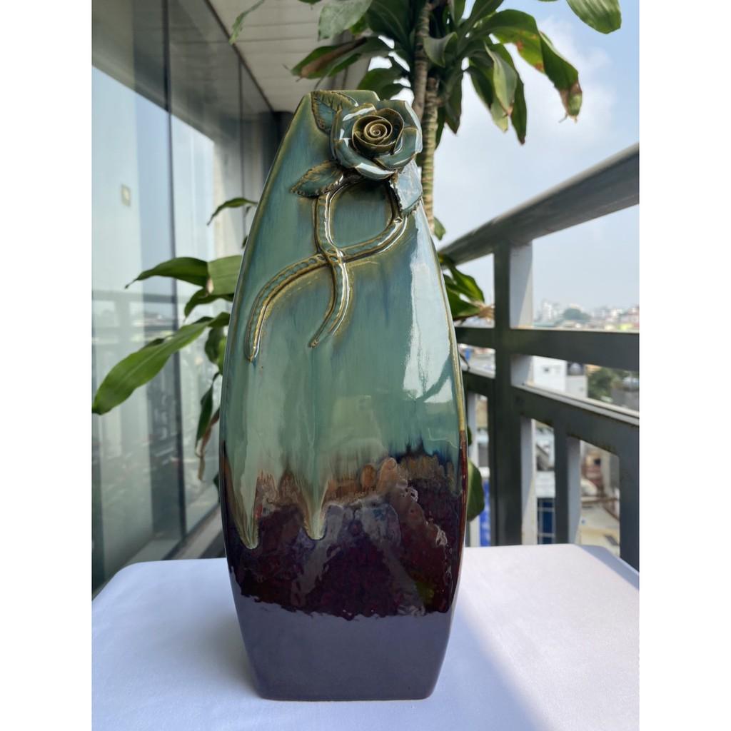 Mua tại TiktokBình hoa Bát Tràng cao cấp loại 1, dáng quả trám lạ mắt với phần họa tiết hoa hồng được đắp nổi ở miệng bình tạo nên một tổng thể hài hòa, ấn tượng. Sản phẩm với nước men hỏa biến xanh phối nâu lạ mắt, màu men được nung ở nhiệt độ phù hợp nên sáng bóng, mịn màng. Bình hoa phù hợp với cắm cành cứng như lựu, mộc lan, mai vàng, hồng, giúp trang trí cho không gian sống trở nên sống động, hấp dẫn, mới mẻ.