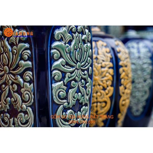 Bình hoa cao cấp Bát Tràng, hàng chuẩn loại 1, dáng chum họa tiết đắp nổi được thực hiện thủ công 100% bởi bàn tay lành nghề của các nghệ nhân làng nghề. Sản phẩm