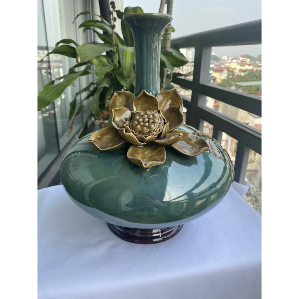 Mua tại TiktokBình hút tài lộc sứ Bát Tràng cao cấp, dáng cổ cao, bụng dẹt, men xanh hỏa biến với nước men căng bóng, sáng mịn cùng với họa tiết hoa sen đắp nổi cầu kỳ, được thực hiện thủ công 100% bởi bàn tay của các nghệ nhân lành nghề. Sản phẩm được trưng bày tại phòng khách, phòng làm việc, văn phòng, cửa hà vừa có tác dụng thu hút tài lộc đến cho chủ nhân vừa có tác dụng trưng các loại hoa theo mùa, giúp trang trí không gian trở nên ấn tượng, thu hút, mới mẻ, hấp dẫn. Bình hút tài lộc cao 35cm, miệng bình 6cm, vòng bụng bình 87cm