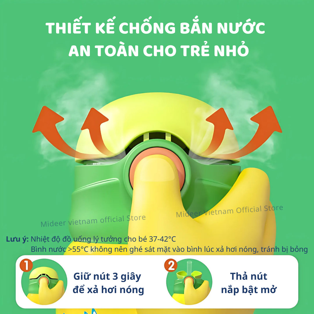 ***Lưu ý: Ba mẹ hướng dẫn con không mở nắp hướng về phía mặt để tránh nguy cơ bị bỏng (đặc biệt với bình chứa nước sôi trên 55°C)