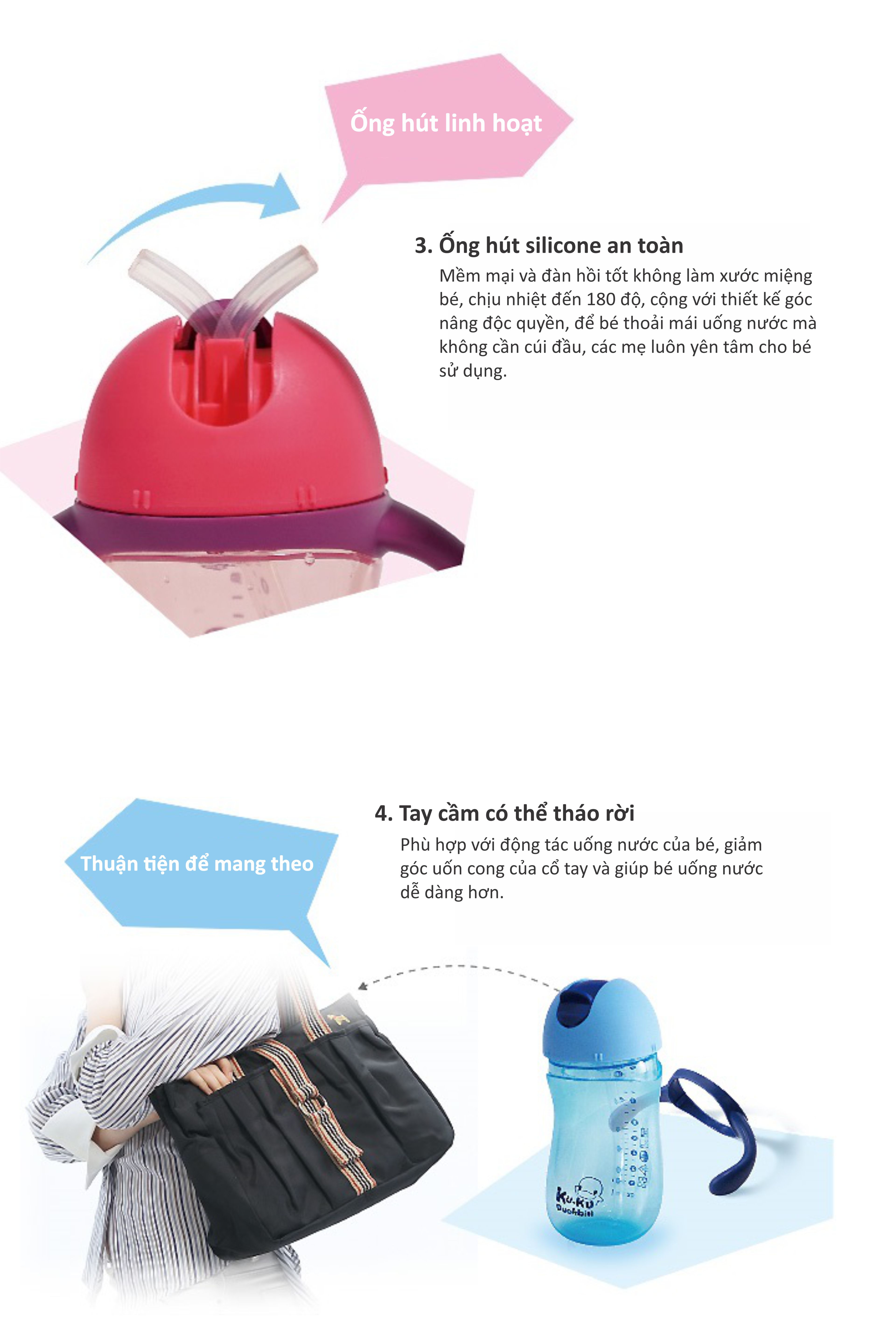 Ống hút cong để bé có thể uống đến giọt cuối cùng thiết ké van chống rồ rỉ và nắp lật mở giúp tránh bị rò rỉ nước ít phụ kiện dễ lắp ráp vả