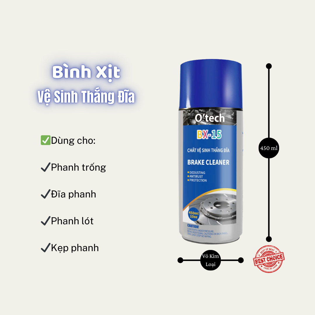 Xịt vệ sinh thắng đĩa O'tech BX-15 là lựa chọn tối ưu để chăm sóc hệ thống phanh của bạn. Với công thức độc đáo, sản phẩm này được sản xuất đặc biệt để loại