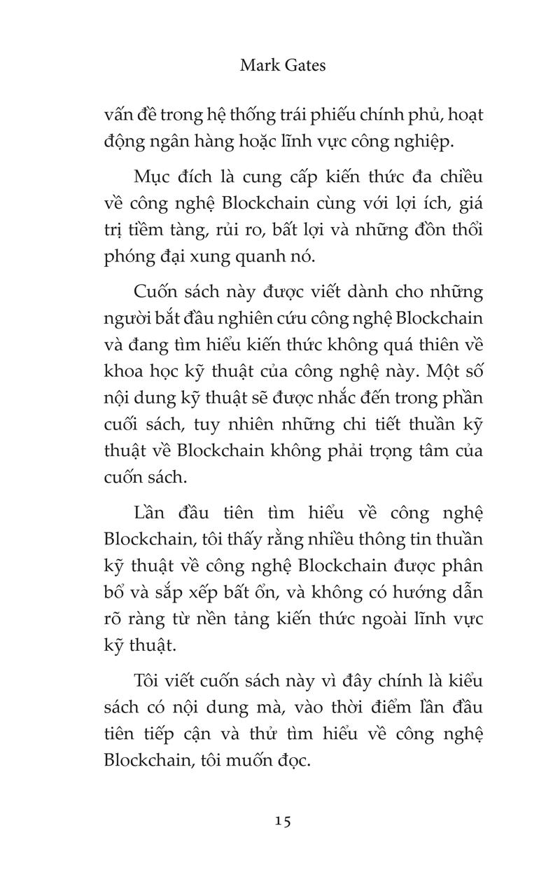 Thực chất, những bài viết cung cấp thông tin về Blockchain và tiền điện tử không thiếu trên các website hay mạng xã hội, nhưng lại chưa đủ tính bao quát và còn khó tiếp thu. Đó là lý do cuốn sách “BLOCKCHAIN: Bản chất của Blockchain, Bitcoin, tiền điện tử, hợp đồng thông minh và tương lai của tiền tệ” của Mark Gates ra đời. Gates cung cấp một bản tóm lược dễ hiểu nhất, cung cấp nền tảng thiết yếu cho những người mới bắt đầu và cả những ai muốn nghiên cứu sâu hơn về công nghệ Blockchain và tiền ảo. Đọc cuốn sách này, bạn sẽ hiểu được Blockchain dưới nhiều khía cạnh, trong đó không chỉ có những lời ngợi khen mà còn không thiếu các chỉ trích, bình luận trái chiều.