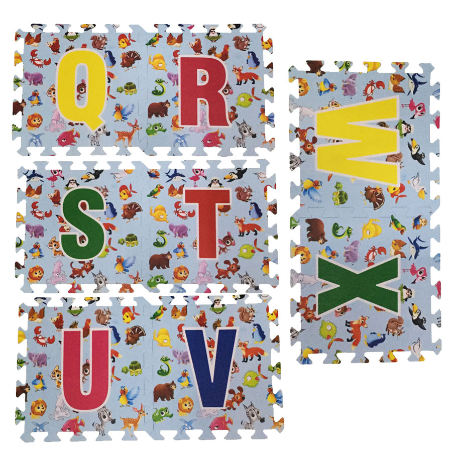 - Bộ 26 chữ cái thảm xốp lót sàn an toàn Thoại Tân Thành (30x30cm) (loại mới) giúp bé làm quen với các chữ cái đầu tiên đồng thời bé còn được học cả một thế giới động vật ở trên không, mặt đất và cả dưới nước như: chim két, bồ nông, chim cánh cụt, gấu, cún con, sóc, cua, cá, sử tử, voi …dưới nền thảm màu xanh nhạt làm nổi bật 26 chữ cái và các loài động vật.