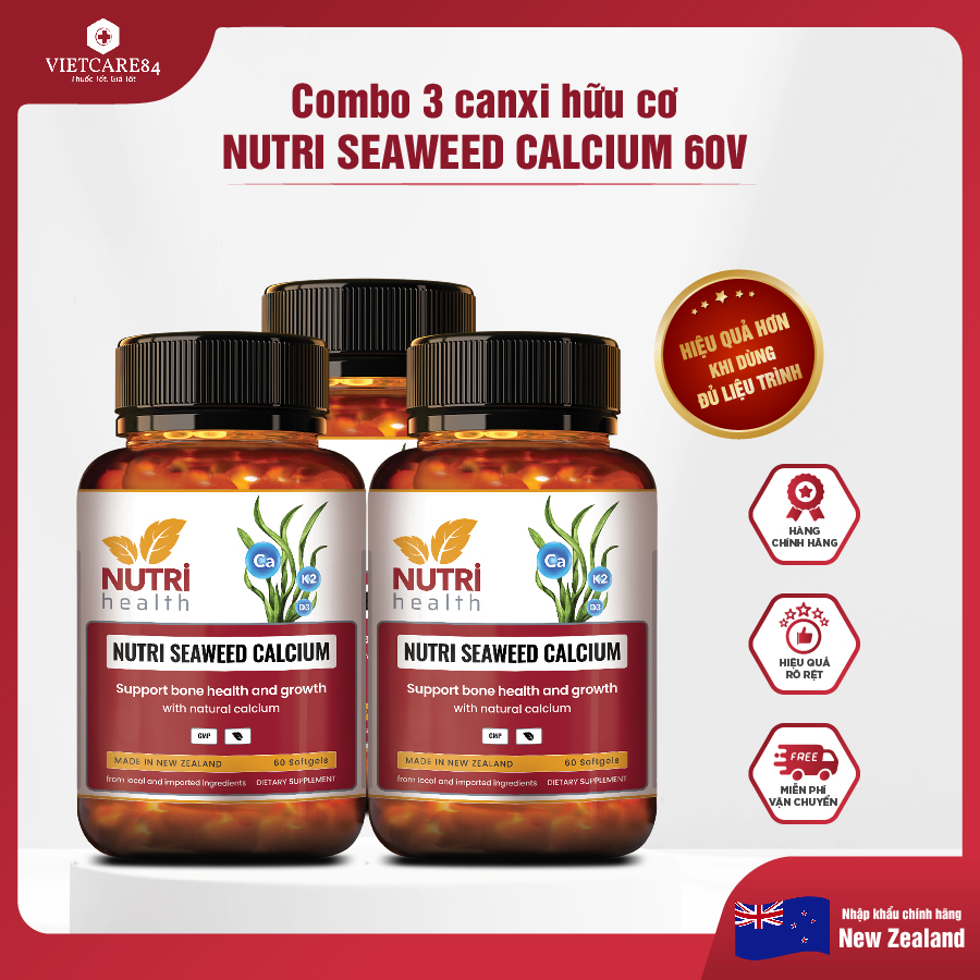 Mua tại TiktokTHỰC PHẨM BẢO VỆ SỨC KHỎE COMBO 3 HỘP NUTRI SEAWEED CALCIUM 60 VIÊN Canxi hữu cơ NUTRI SEAWEED CALCIUM Bổ sung canxi hữu cơ chiết xuất từ tảo biển. Sản xuất tại New Zealand NUTRI SEAWEED CALCIUM là nguồn cung cấp canxi hữu cơ từ tảo biển, kết hợp vitamin K2 và D3 giúp cơ thể hấp thu canxi nhanh hơn, hỗ trợ tăng chiều cao tối ưu và hỗ trợ xương chắc khoẻ. THÀNH PHẦN CANXI HỮU CƠ NUTRI SEAWEED CALCIUM : Tính trong 1 viên
