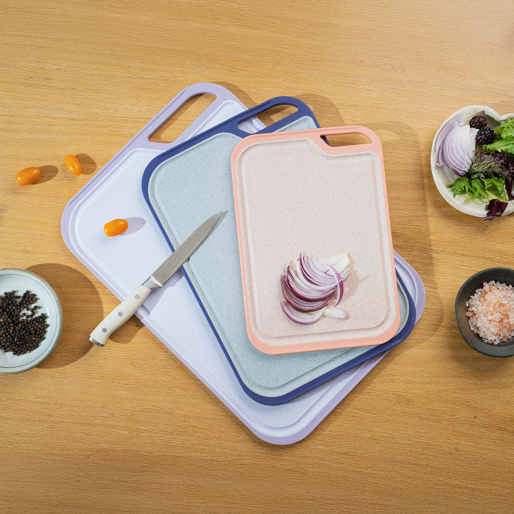 • 3 kích thước thớt khác nhau, dùng để cắt thịt, thái rau củ hoặc xử lý đồ ăn chín.