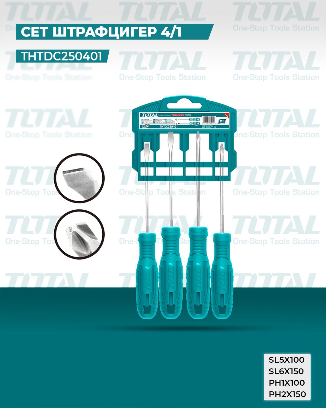 Thông số kĩ thuật -Mã sản phẩm: THTDC250401 -Nhà sản xuất: Total -Thép công nghiệp S2 -Bộ 4 tua vít - Kiểu dáng tay cầm Total mới -Chất liệu thép 40Cr. Đuôi tròn -Gồm 1cái SL5X100mm,1cái SL6X150mm. 1cái PH1X100mm -1cái PH2X150mm. Đóng gói trong móc treo nhựa. 30/T