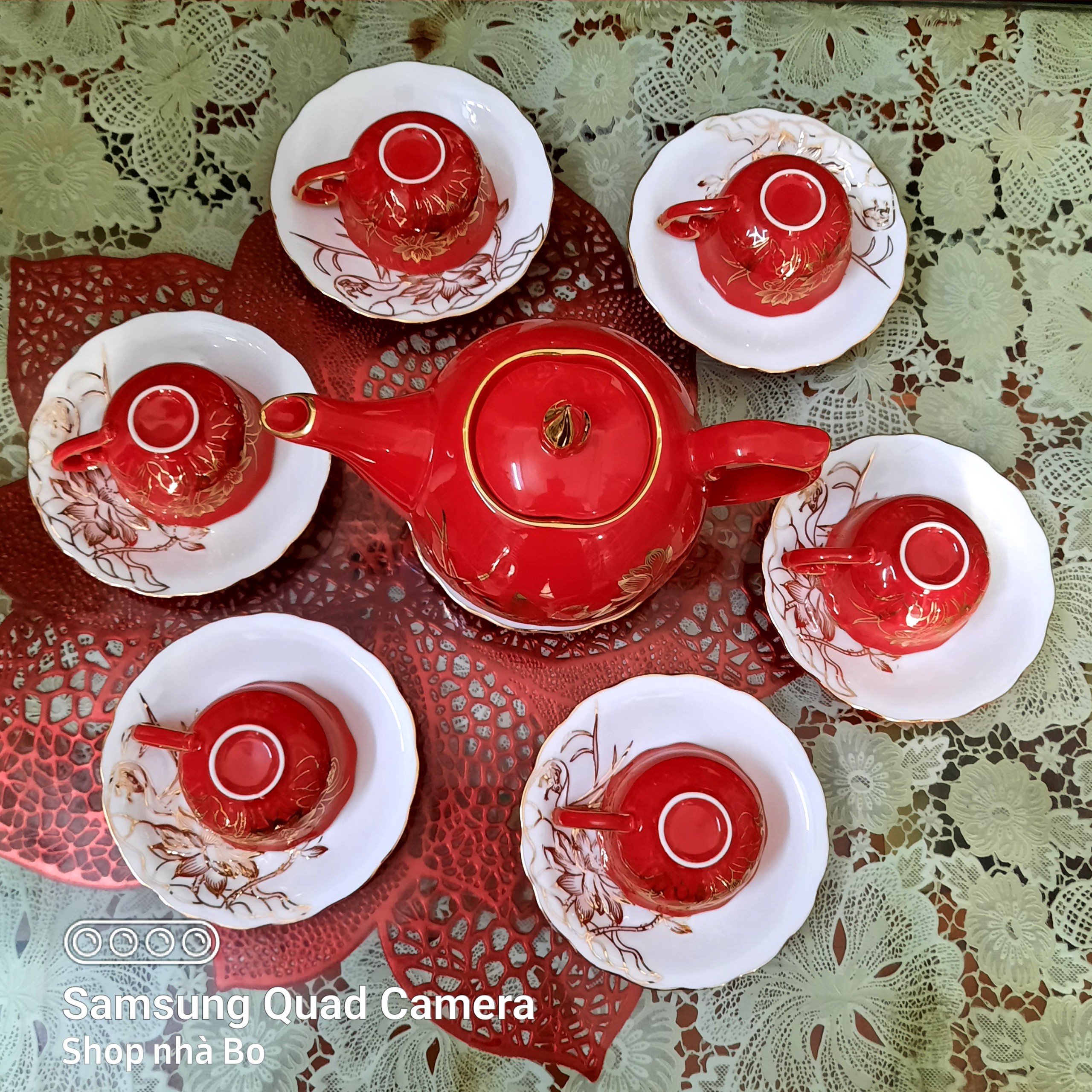 Bộ ấm chén Bát Tràng cao cấp mẫu đơn đỏ vẽ sen vàng được thiết kế hoàn toàn khác biệt, thích hợp với những người yêu thích màu đỏ. Phù hợp sử dụng trong các không gian sang trọng như phòng khách lớn, phòng hội họp… với bình trà lớn đáp ứng cho 8-10 người sử dụng. được chế tác tinh sảo rất tỉ mỉ do những nghệ nhân có kỹ thuật, tay nghề vô cùng điêu luyện có thể làm hài lòng nhữngkhách hàng khó tính nhất.