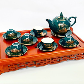 ✨Bộ ấm chén Bát Tràng cao cấp màu xanh Arctic họa tiết hoa sen vẽ vàng 24k