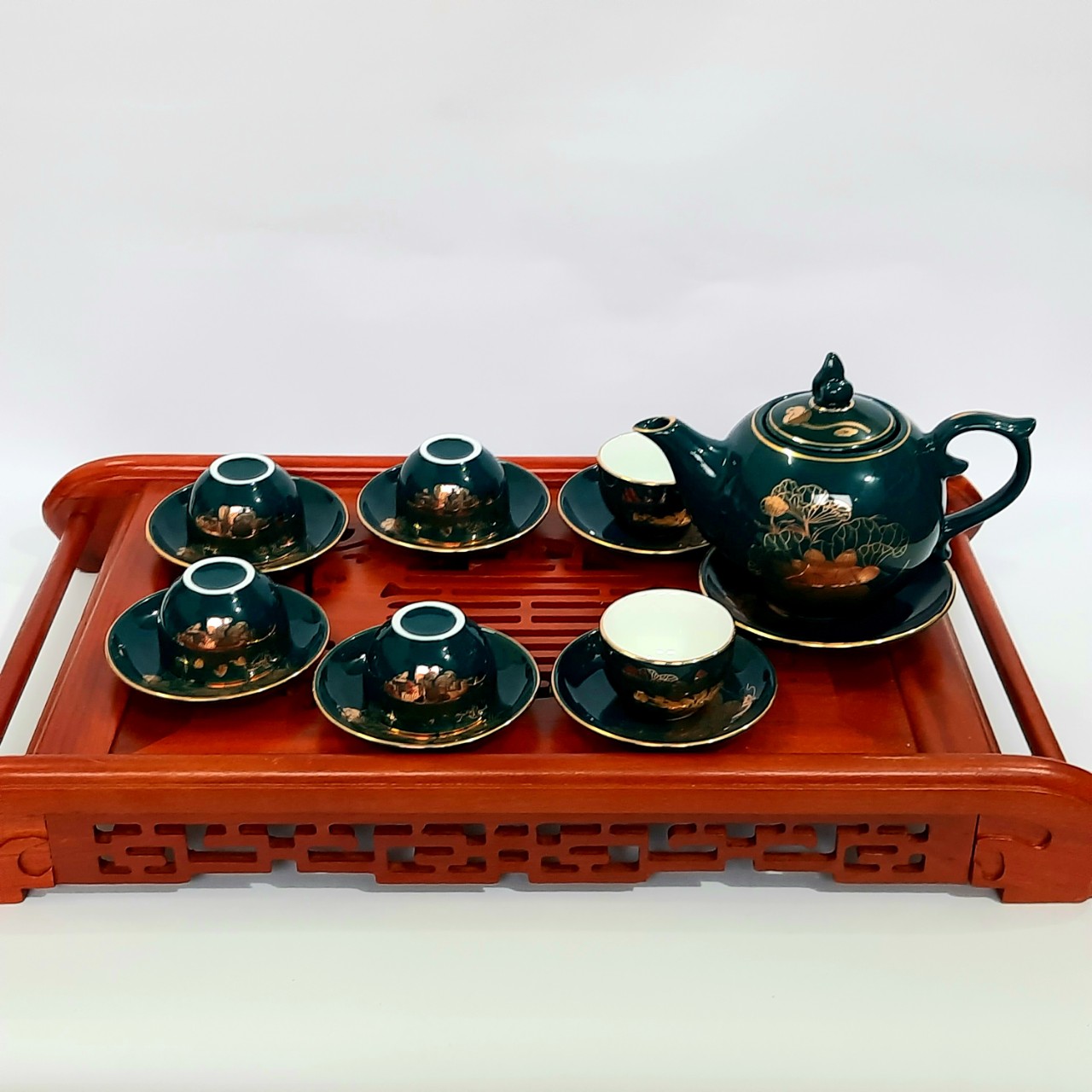 - Bộ sản phẩm bao gồm: 1 ấm trà dung tích 500ml. 6 chén dung 50ml. 1 đĩa kê ấm. 6 đĩa kê chén. Bộ sản phẩm không bao gồm khay. Đặc điểm nổi bật: Bộ ấm chén Bát Tràng cao cấp màu xanh Arctic họa tiết hoa sen vẽ vàng 24k +100% sản phẩm được khử chì, độc tố ở nhiệt độ là 1350d tiêu chuẩn xuất khẩu đã được đăng ký nhãn hiệu độc quyền, đáp ứng yêu cầu khắt khe nhất kể cả thị trường khó tính như Châu Âu.