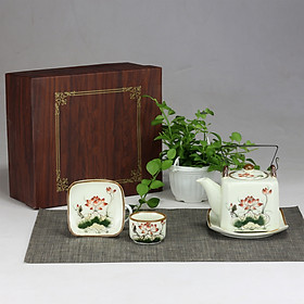 Bộ sản phẩm bao gồm: 1 ấm trà, 1 đĩa ấm, 6 chén trà, 6 đĩa chén Hoa sen là biểu tưởng đẹp về đức tính con người Việt: mạnh mẽ vươn lên, không