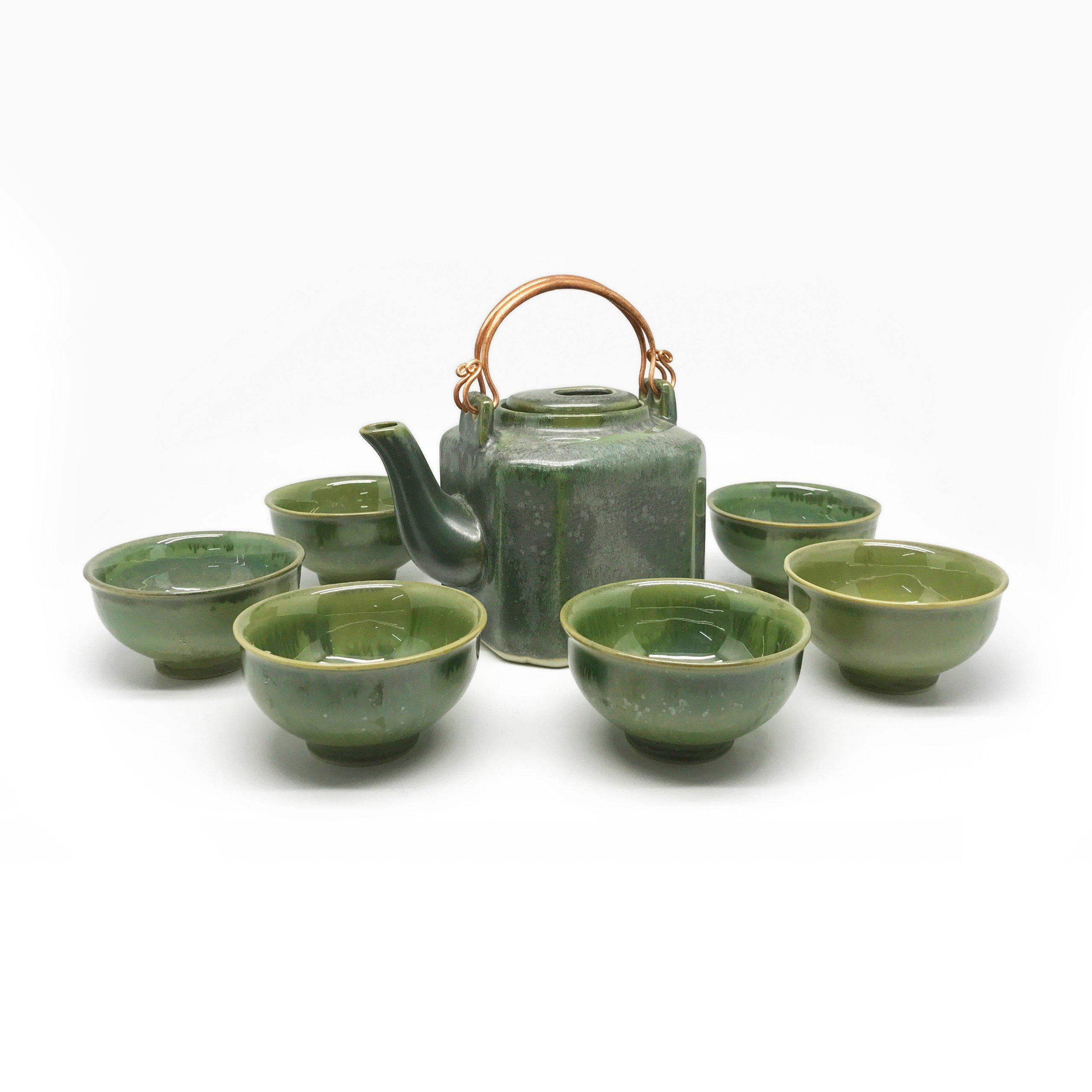 Bộ ấm chén men nâu gồm: 6 chén 1 ấm 7 đĩa. Màu men, nâu, xanh lòng trắng, xanh, dùng để thưởng trà trưng bày nghệ thuật. Sản xuất tại Bát Tràng, đun ở nhiệt