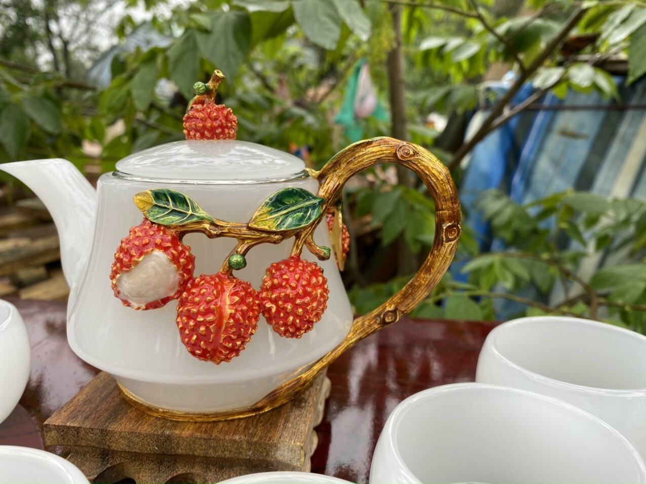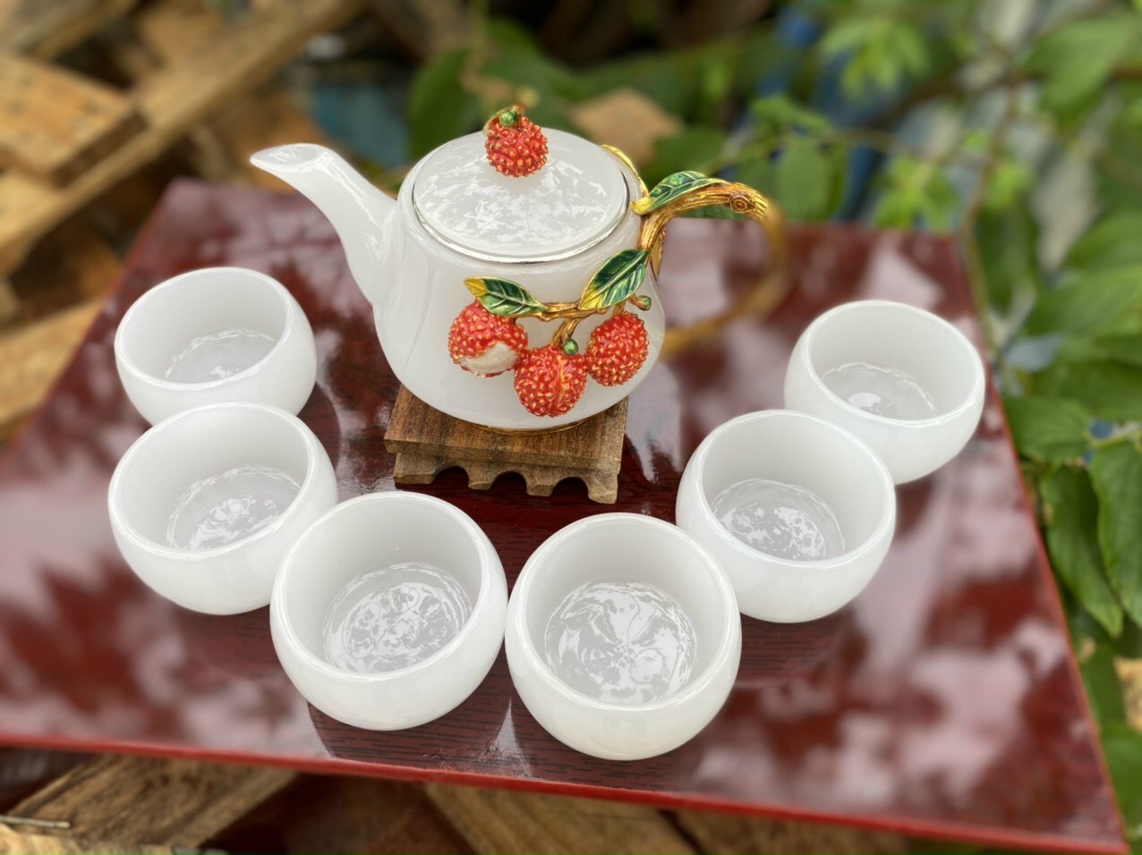 ✨Bộ ấm trà chạm cây vải đá bạch ngọc