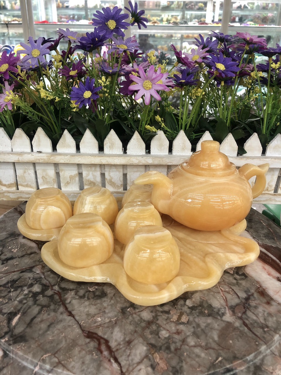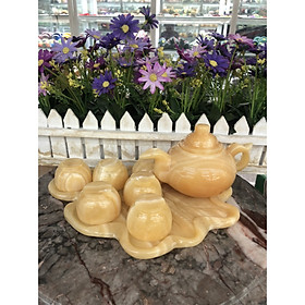 Chất liệu: Đá ngọc Onyx Bộ sản phẩm gồm: 7 dĩa, 6 ly và 1 ấm trà Khối lượng: 1,5 kg Sử dụng làm vật phẩm trang trí nhà cửa, quà biếu hoặc có thể
