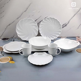 Bộ bát đĩa quà tặng Lộc Phát 10 món bằng sứ trắng cao cấp tại cửa hàng sứ Long Phương với hình dáng độc đáo, sử dụng trong các dịp đặc biệt hoặc lễ tết. Các sản phẩm với hình dáng độc lạ, đẹp mắt thể hiện nét riêng của gia chủ, đồng thời cũng mang lại ấn tượng sâu sắc cho người dùng cơm vì các thiết kế sáng tạo, thể hiện sự tỉ mỉ, chỉnh chu của người chuẩn bị bữa cơm. Bộ sản phẩm nhiều mẫu đĩa kiểu với hình dáng tựa những cánh hoa.