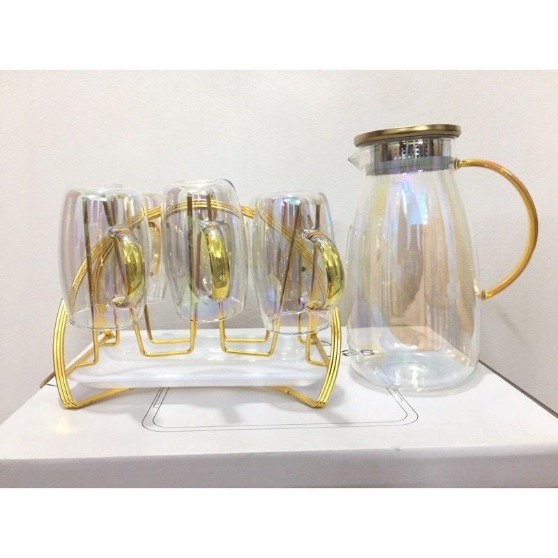 Bộ bình 6 cốc thủy tinh chịu nhiệt mạ vàng cao cấp