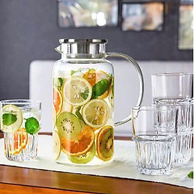 Chi tiết sản phẩm: • 01 Bình nước dung tích 1.9L (Pitcher) • 04 Ly thủy tinh 340ml (Tumblers) Tổng cộng 5 món tiện dụng Ưu điểm nổi bật: • Thủy tinh borosilicate cao cấp,