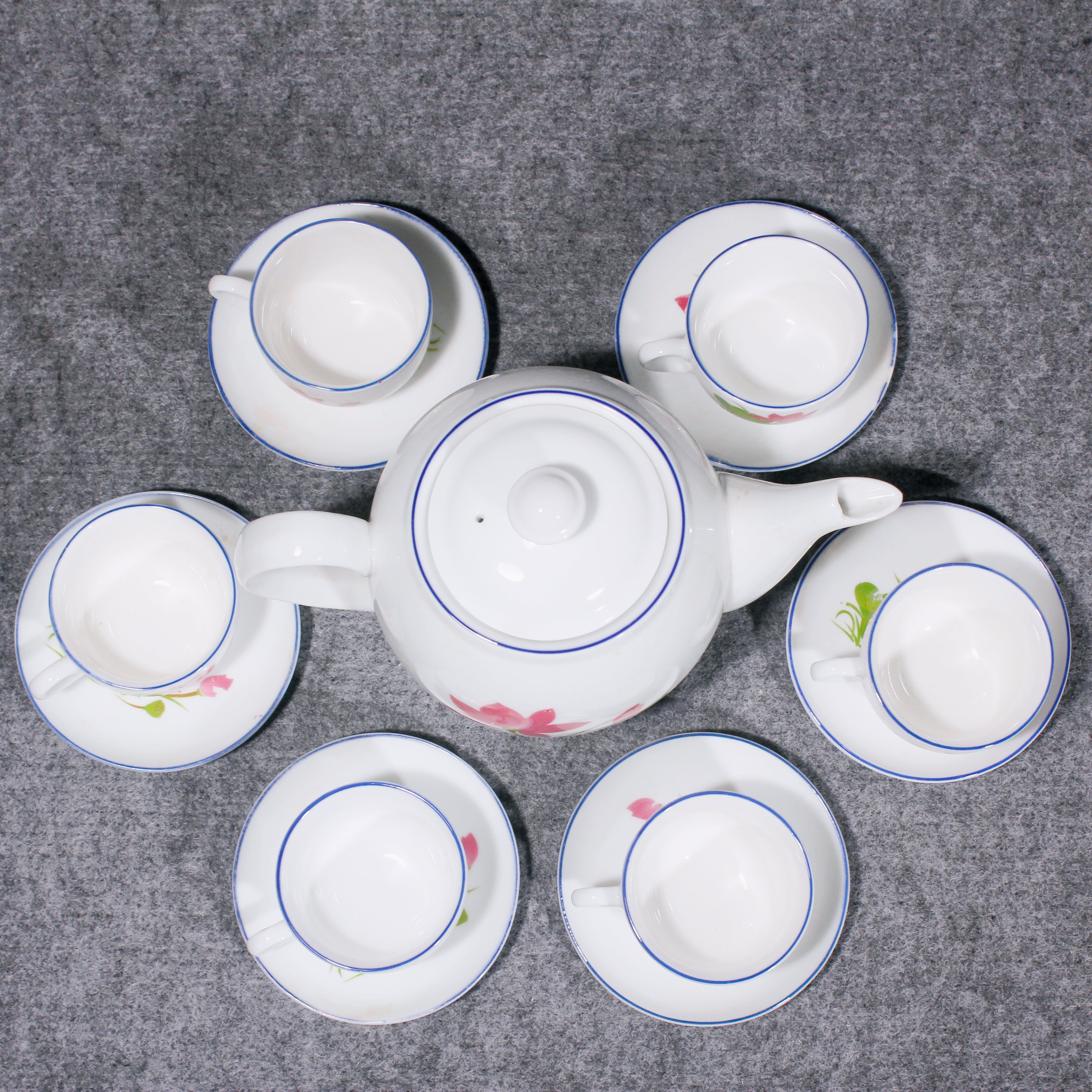 Bộ sản phẩm bao gồm: 1 ấm trà, 1 đĩa ấm, 6 chén trà, 6 đĩa chén   Hoa sen là biểu tưởng đẹp về đức tính con người Việt: mạnh mẽ vươn lên, không