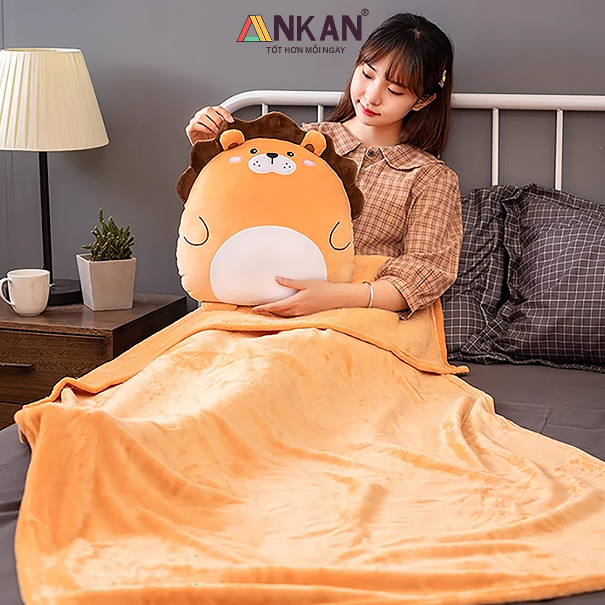 Bộ Chăn Gối Văn Phòng Đa Năng Hình Thú Gấu Bông Dễ Thương, Tiện Lợi Cho Bé Đi Học Và Du Lịch        CHĂN GỐI VĂN PHÒNG ANKAN CÓ GÌ ĐẶC BIỆT    Thiết kế hình thú xinh xắn, phù hợp làm quà sinh nhật, quà tặng bạn bè, người yêu, đồng nghiệp.  Đa năng 3 trong 1: vừa là gối ôm – gối tựa lưng – gối luồn tay, kèm chăn êm giữ ấm.  Sử dụng tiện lợi cho nhiều mục đích: ngủ trưa văn phòng, đi học, đi làm, du lịch. Trên sản phẩm có nhãn chữ “はい” (hai) – nghĩa là “Vâng” trong tiếng Việt, mang đến cảm giác dễ thương, tích cực và gần gũi theo phong cách Nhật Bản.        CAM KẾT TỪ ANKAN    Sản phẩm đúng mô tả, đúng mẫu, đúng kích thước.  Đổi trả trong 15 ngày nếu khách không hài lòng.  Hoàn tiền 100% nếu sản phẩm lỗi do nhà sản xuất.  Đóng gói sạch sẽ, an toàn, giao hàng nhanh chóng.        THÔNG SỐ KỸ THUẬT  Kích thước gối: 40 x 35 cm.  Kích thước chăn: 100 x 170 cm (được lồng gọn trong gối).  Chất liệu vỏ: vải nhung siêu mềm.  Chất liệu ruột: bông PP cao cấp, an toàn cho da.  Trọng lượng: khoảng 800g.  Có 4 kiểu dáng để bạn lựa chọn là Cáo Đỏ, Cá Voi Xanh, Cừu Trắng và Gấu Nhật Bản        ƯU ĐIỂM NỔI BẬT    Vải nhung mềm mịn, thoáng khí, dễ giặt sạch.