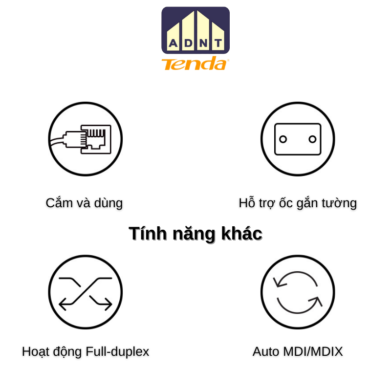 8 cổng RJ45 10/100Mbps với kỹ thuật chiếm quyền điều khiển cáp (Auto-Negotiation) và hỗ trợ tính năng MDI/MDIX Công nghệ Ethernet xanh giúp tiết kiệm điện năng tiêu thụ Kiểm soát lưu lượng IEEE