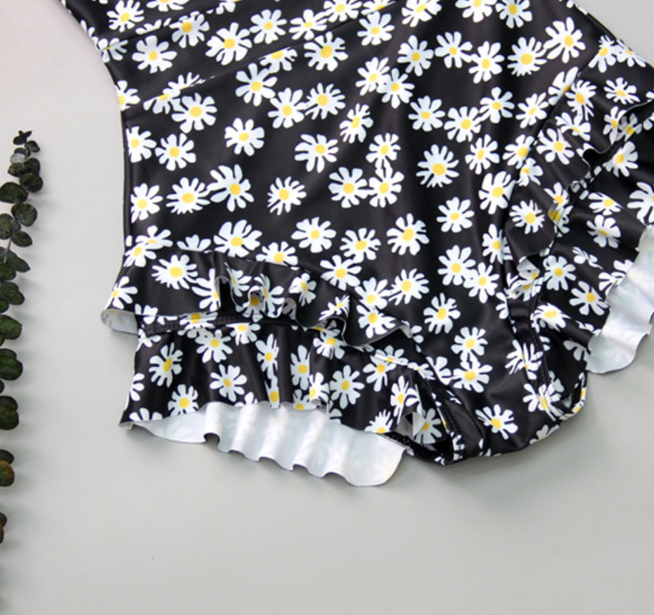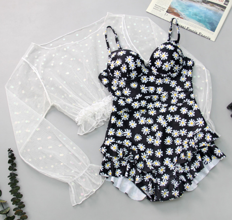 ✨Bộ đồ bơi bikini nữ 1 mảnh đi tắm biển hoa cúc kèm áo croptop ren trắng chấm bi tiểu thư hot trend 2021- B02