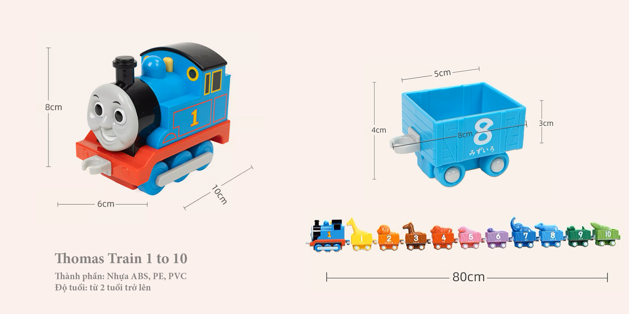 Bộ đồ chơi xe lửa Thomas - Đếm số từ 1 đến 10 Thương hiệu: Gakken Hongkong Xuất xứ thương hiệu: Nhật Bản Kích thước: 36 * 20 * 36 Chất liệu: Nhựa ABS. PP