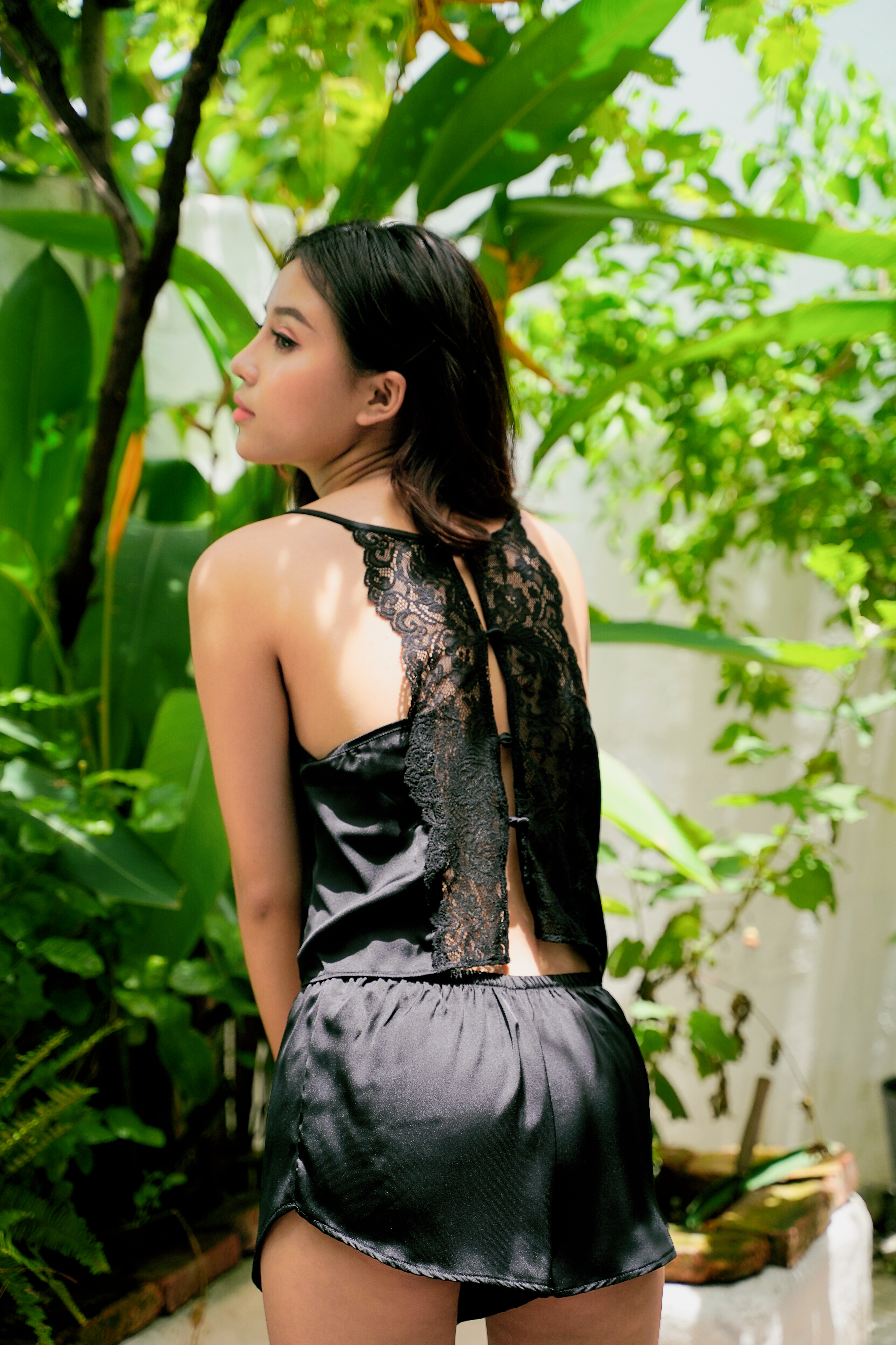 Thương hiệu: Sanny House Tên sản phẩm: Bộ đồ ngủ Chất liệu: lụa cao cấp mềm mịn, co giãn, thấm hút tốt Kiểu dáng: gợi cảm, trẻ trung, hiện đại Màu: đen Size: dưới 56kg