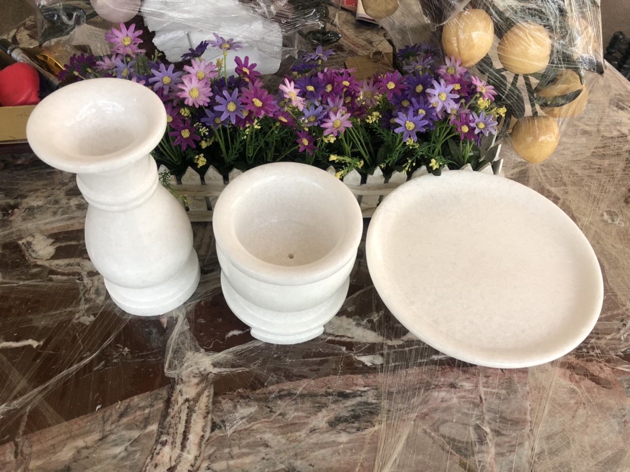 Bộ đồ thờ đá trắng 25cm gồm: 1 bát hương cao 15cm, 1 đĩa bồng đường kính 25cm, 1 lọ hoa cao 25cm
