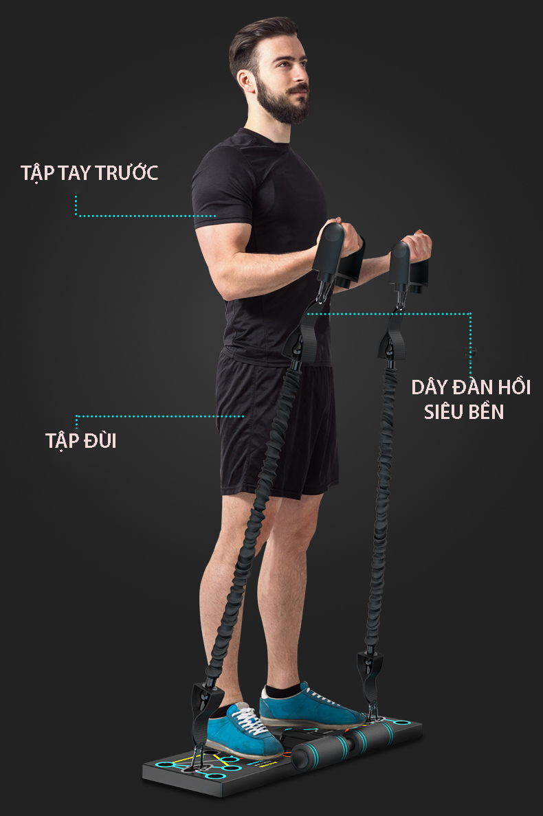 - Bộ dụng cụ hít đất đầy đủ gồm: 1 bảng tập chống đẩy + 2 tay nắm + 1 dụng cụ tích hợp gập bụng + 2 dây kéo tay + 1 ống kẹp cửa tập tay.