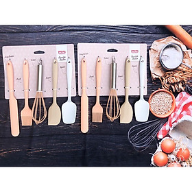 1 bộ gồm 5 chiếc: thìa phết kem, chổi quét, dụng cụ đánh trứng, phới vét kem, thìa. - Không có hạn sử dụng - Chất liệu silicone - Hàng mới 100%.