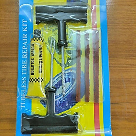 Bộ sản phẩm Dụng Cụ Vá Lốp Không Săm gồm : 1 cây dùi, 1 cây gim, 1 chai keo 12ml và 3 sợi cao su non.