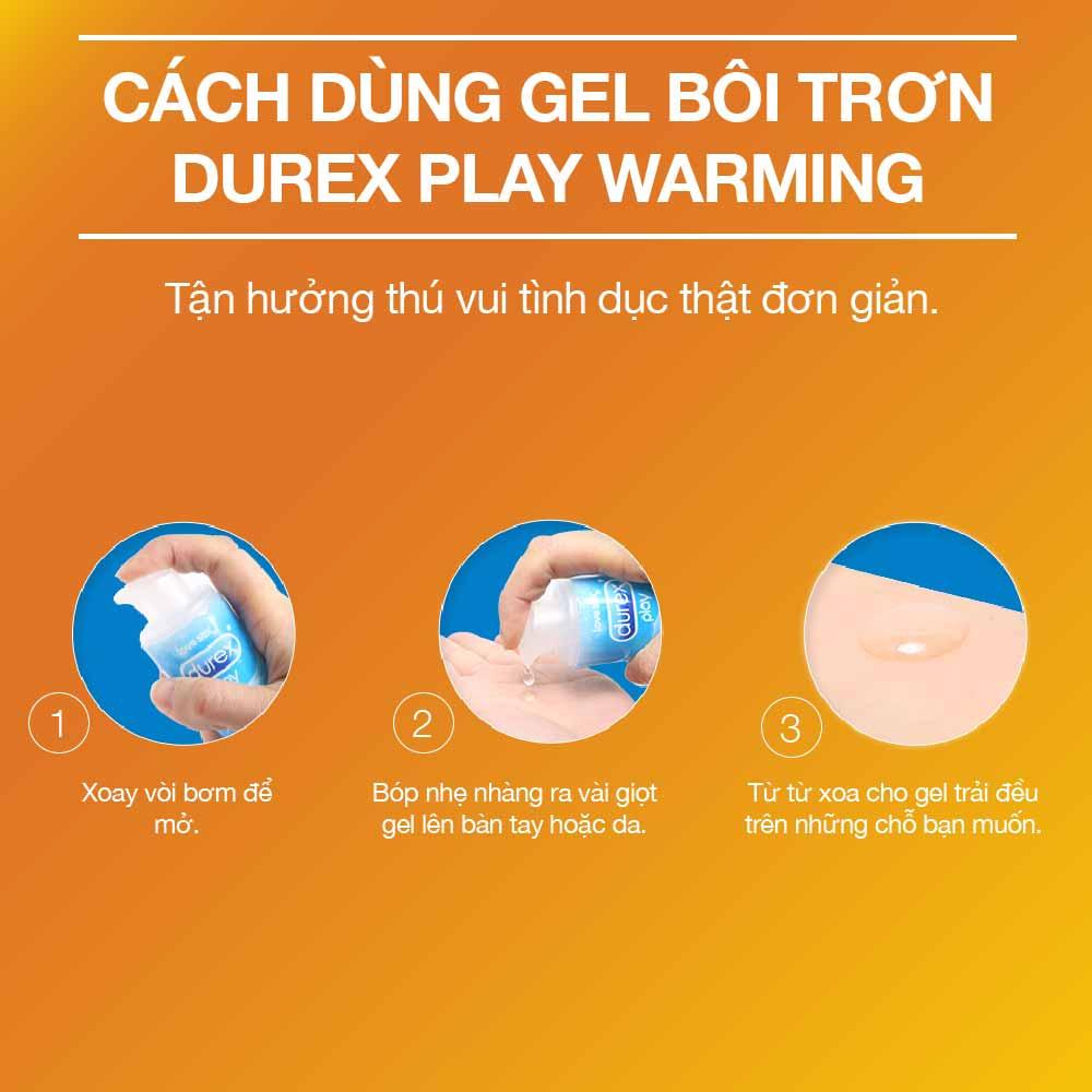 Dung dịch bôi trơn Durex Play Warming Durex Play Warming là sản phẩm bôi trơn làm ấm được sản xuất trên dây chuyền tiên tiến của hãng Durex – Thái Lan. Dung dịch bôi trơn