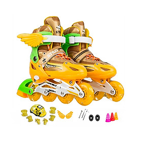 Sản phẩm giày patin với thiết kế chắc chắn, đảm bảo sự an toàn tối đa cho trẻ, đồng thời sản phẩm có gắn thêm đền flash bắt mắtgiúp trẻ thêm yêu thích khi di chuyển trên giàyBộ sản phẩm gồm: đôi giày, mũ bảo hiểm, bộ bảo vệ dày 6 bộ (2 miếng bảo vệ gối, 2 miếng bảo vệ tay ), 3 chướng ngại vật tập luyện, 2 cánh, 1 vít, 1 cặp lếchLà sản phẩm giày patin chất lượng được thiết kế dành cho trẻ, đảm bảo sự an toàn cho trẻ giúp trẻ có những khoảng thời gian vui chơi thoải mái nhất
