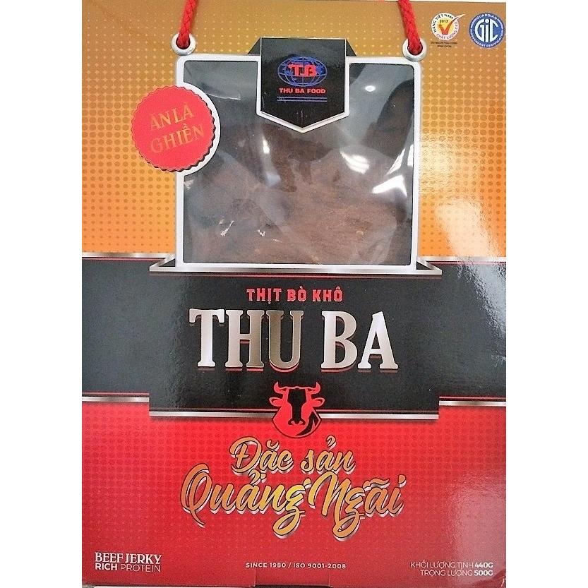 Hộp giấy 500g có quai xách, KLT 440g, bên trong có túi nilon bảo quản, rất thích hợp làm quà tặng.Bò Khô Thu Ba là món ăn đặc sản vùng quê Quảng Ngãi được sản xuất theo công thức truyền thống kết hợ...