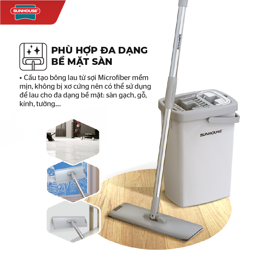 Đặc điểm nổi bật Bộ Lau Nhà 360 Độ Sunhouse Thế Hệ Mới KS-CL260PG có thiết kế gọn nhẹ, lau dọn nhanh chóng Cán bằng inox 201 có tay cầm bọc nhựa chắc chắn Bộ
