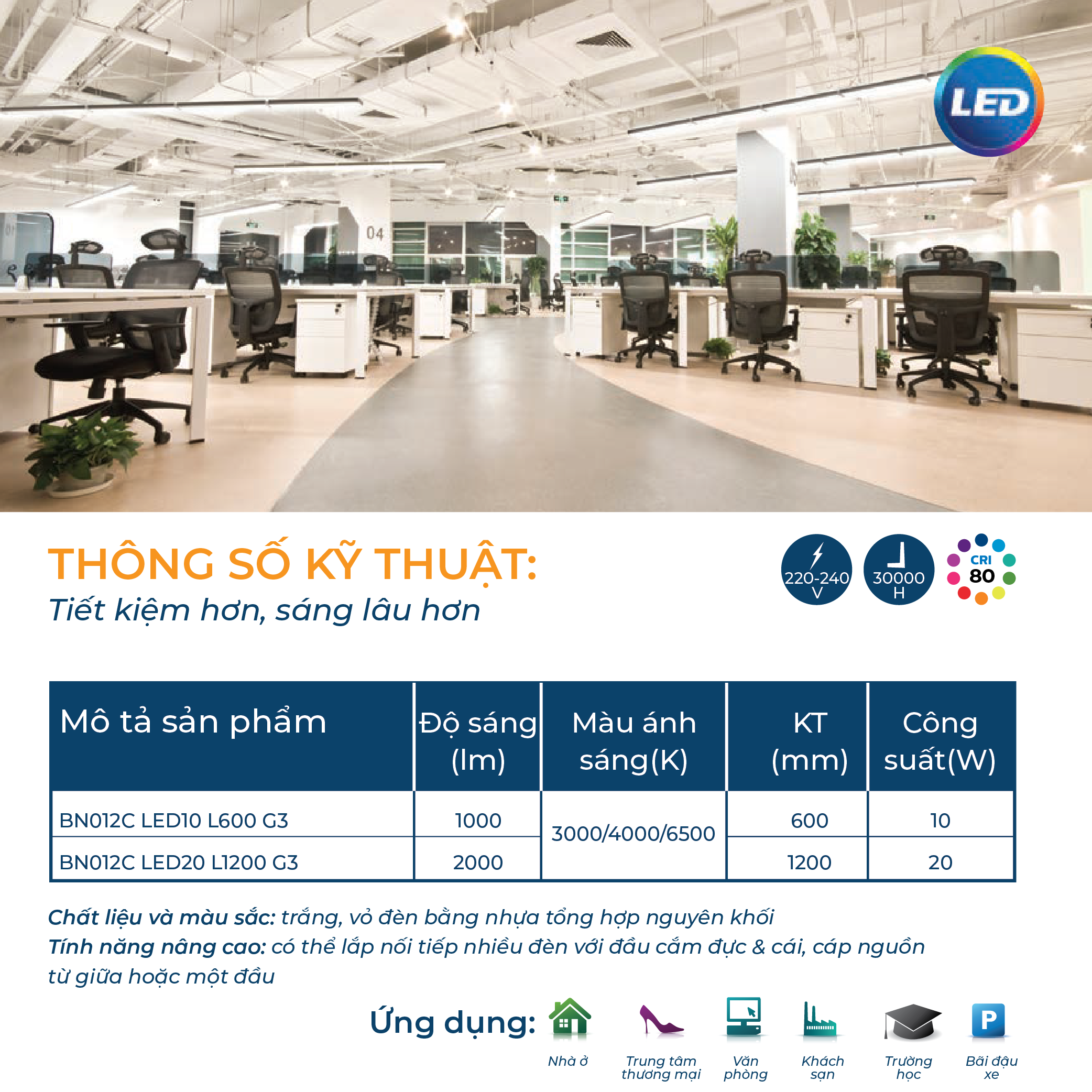 - BN012C LED20 -Kích thước: 1200 mm -Độ sáng: 2000lm -Màu ánh sáng: 3000K/ 4000K/ 65000K